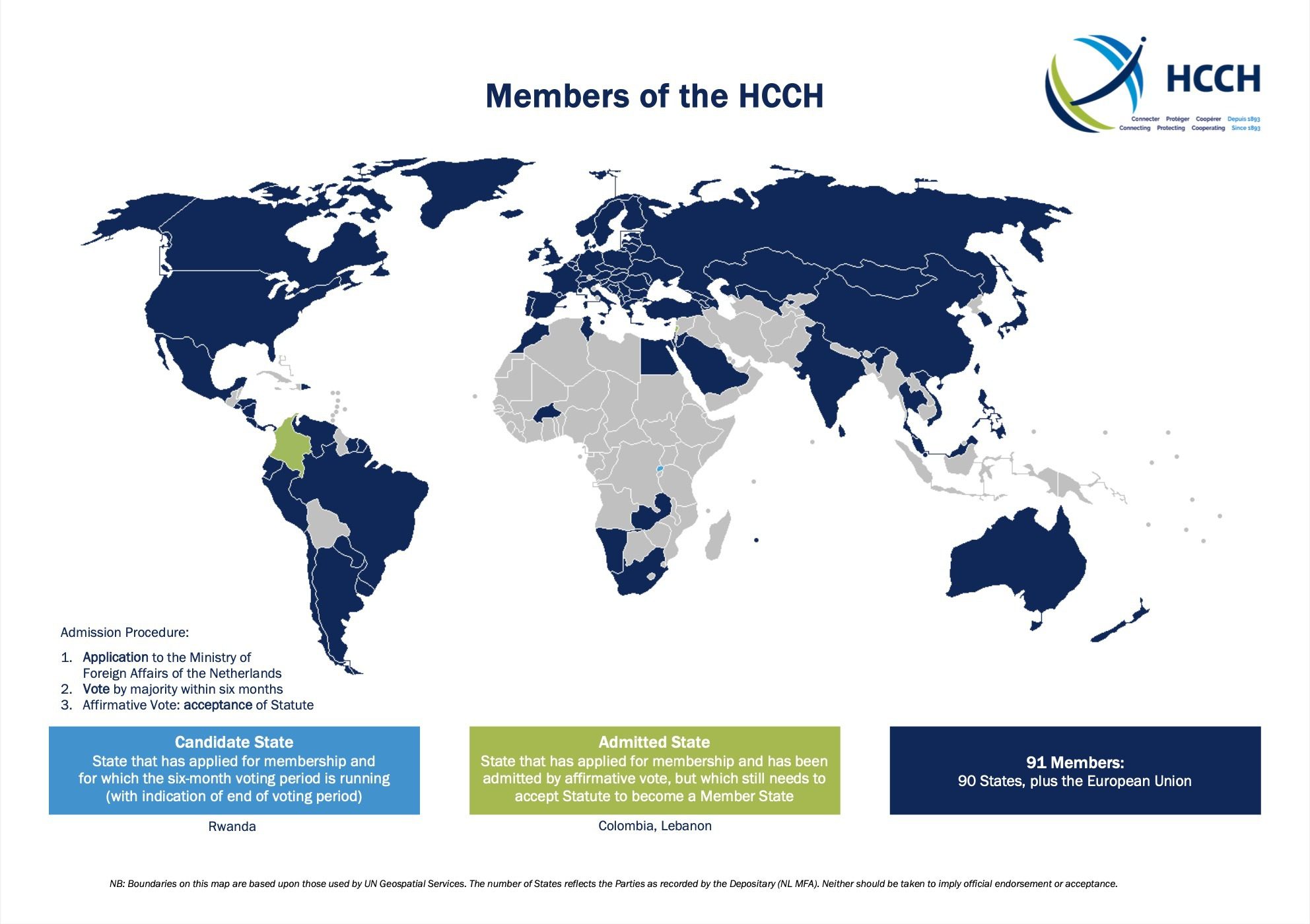 HCCH 目前有 91 个成员:90 个国家和 1 个区域经济一体化组织